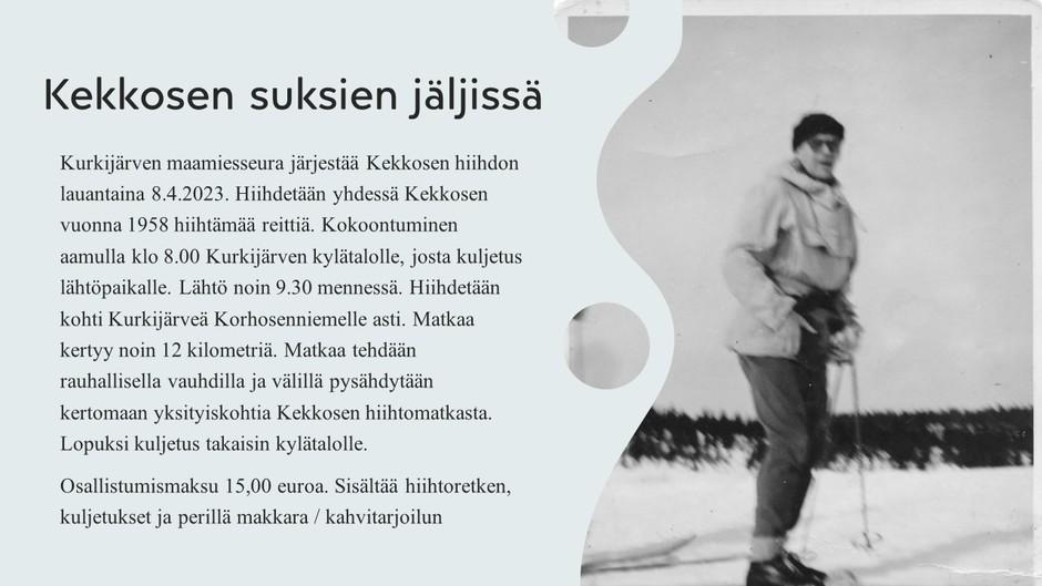 Kurkijärven maamiesseura järjestää Kekkosen hiihdon toisen kerran lauantaina 8.4.2023. Hiihtoretki mukailee Kekkosen vuonna 1958 hiihtämää reittiä.