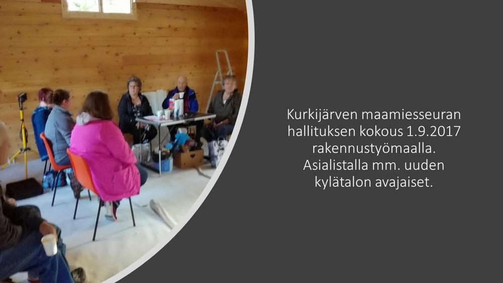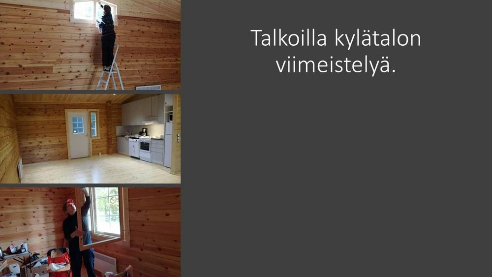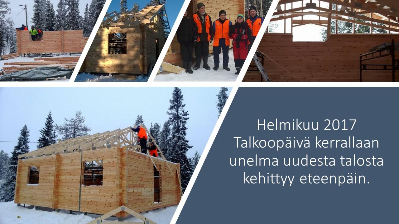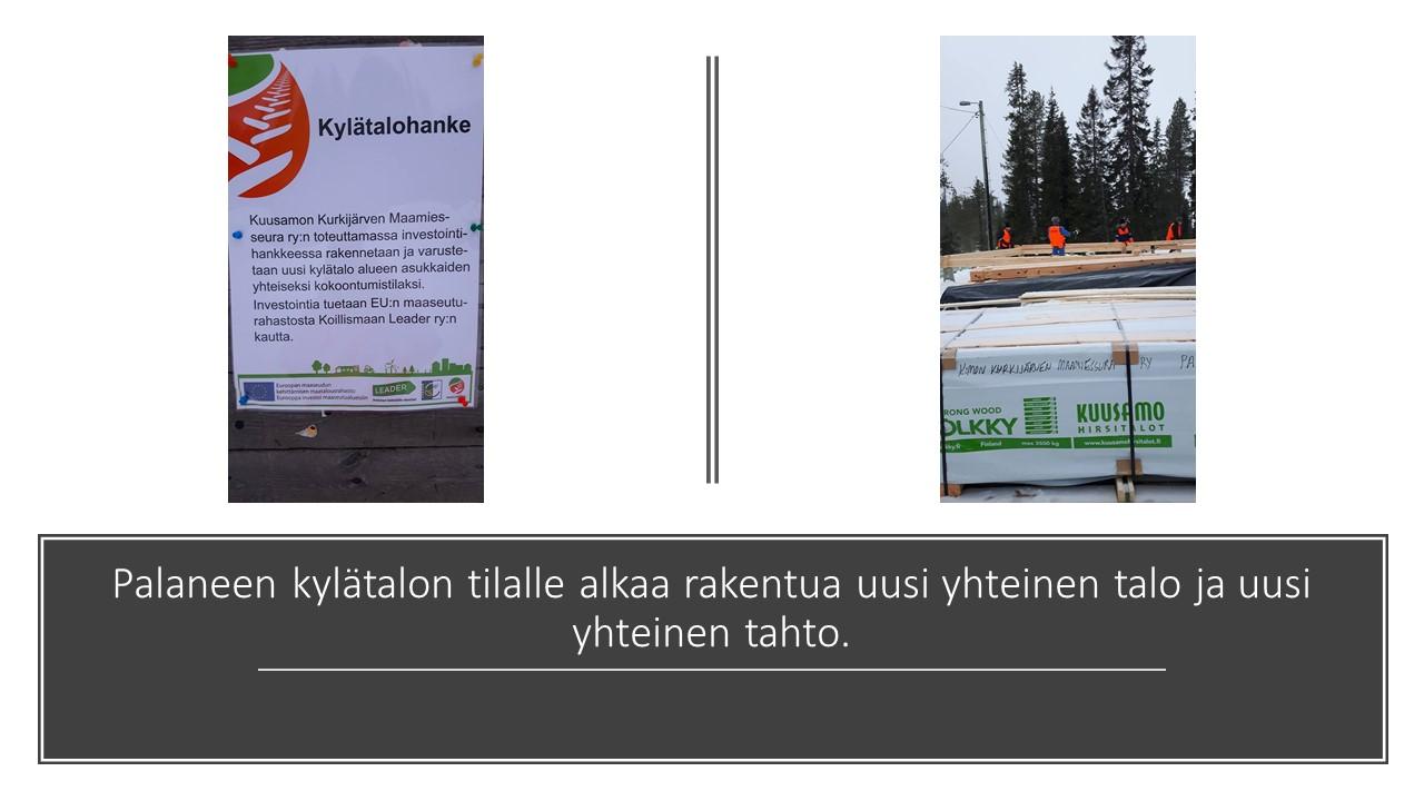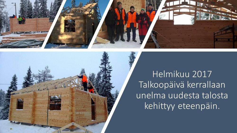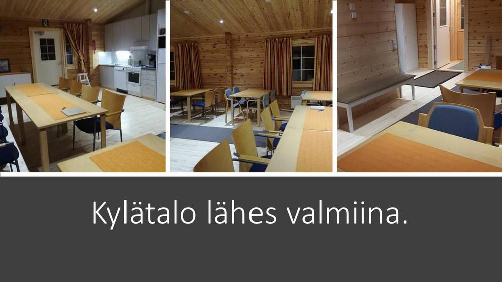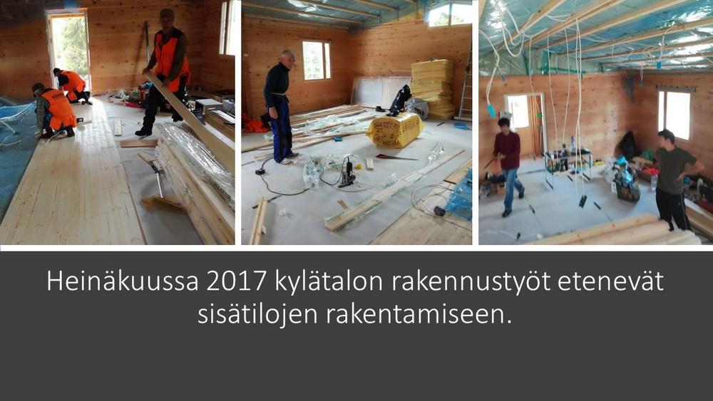 Hanke valmisteltiin ja se hyväksyttiin rahoitettavaksi. Sen jälkeen alkoi varsinainen rakentaminen. Hirsikehikko tilattiin paikalliselta yritykseltä, tietysti kilpailutuksen jälkeen, kuten rahoituksen ehdot vaativat. Syksyllä tehtiin perustuksen vaatimat työt liittymävarauksia myöten. Helmikuussa alkoi sitten kehikon pystytys. Talkooporukkaa riitti niin, että syksyllä 2016 voitiin viettää uuden raikkaalle tuoksuvan Kylätalon avajaisia. Siinä vaiheessa meillä oli kokoontumistila noin 40 henkilölle kaikkine tykötarpeineen. Astiastot, keittimet, kattilat ja kokoustekniikka oli valmiina käyttöönotettavaksi. Kymmeniä kokouksia ja tapaamisia on jo pidetty, kaikkea seurakunnan tilaisuuksista perhejuhliin ja eri toimijoiden kokouksiin.