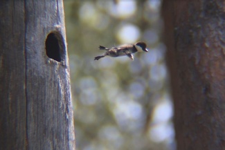Se onkin sitten mielenkiintoista, kun kuukausi on kulunut ja odotellaan poikasten lähtöä. Kuoriuduttuaan poikaset lähtevät pöntöstä vuorokauden kuluttua. Olemme nähneet lukemattomia kertoja kun poikaset hyppivät maahan, emo on laskeutunut maahan, ääntelee yleensä maantiellä. Poikaset lähtevät jonossa menemään ääntä kohti.